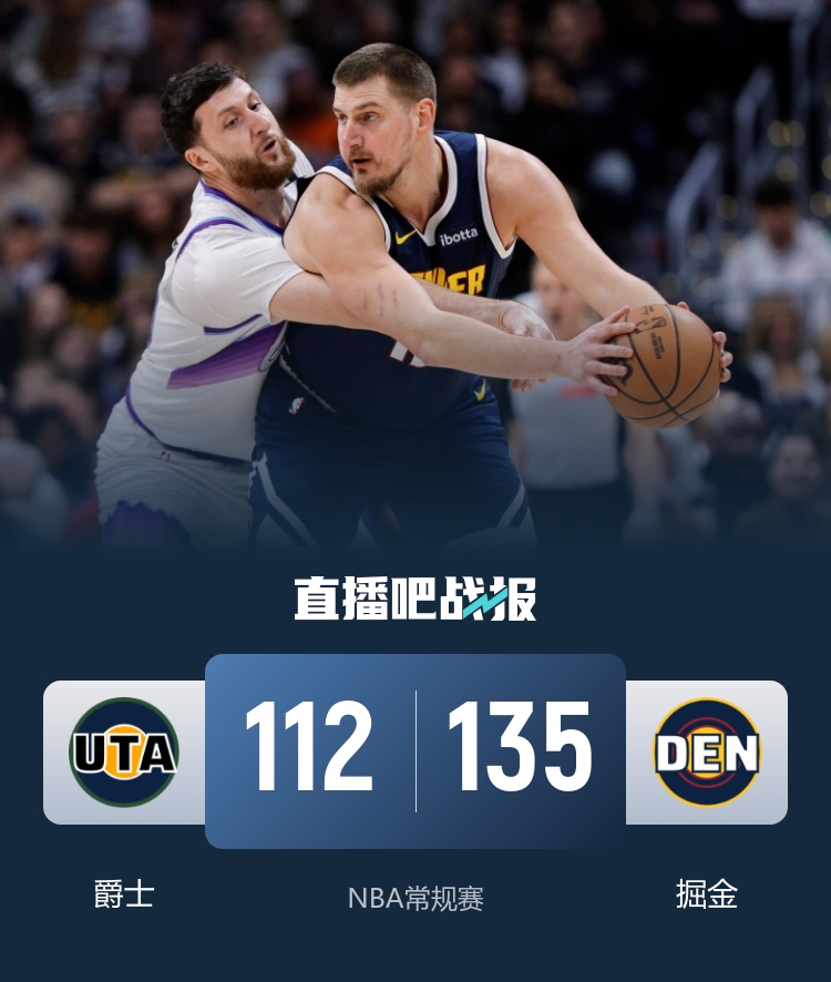 比赛开始,掘金外线接连发炮轰出19-0梦幻开局,打了5分钟森萨博三分终于为爵士拿到首分,随后爵士8-0止血,但掘金首节还是领先到25分,次节爵士首发五人进攻端回暖,约基奇继续串联,卡梅隆·约翰逊外线4记三分弹无虚发,双方对攻,半场掘金继续领先23分。下半场,马尔卡宁联手乔治助队追分,但约基奇不到半节拿到三双,掘金牢牢保持20分以上领先,末节小哈达威连续3记三分扩大到近30分领先,爵士再无机会,双方替补练兵,最终掘金135-112轻取爵士。